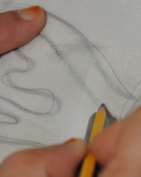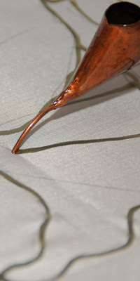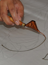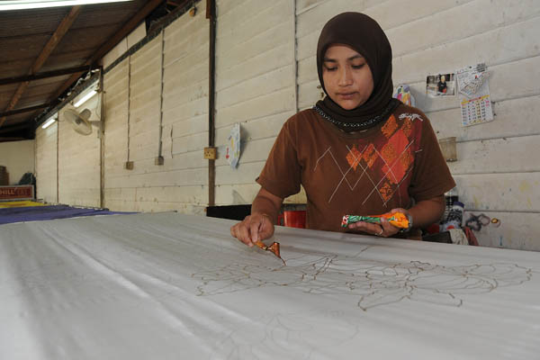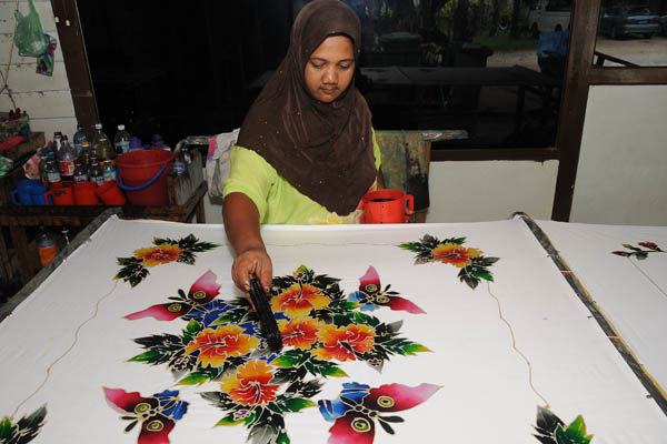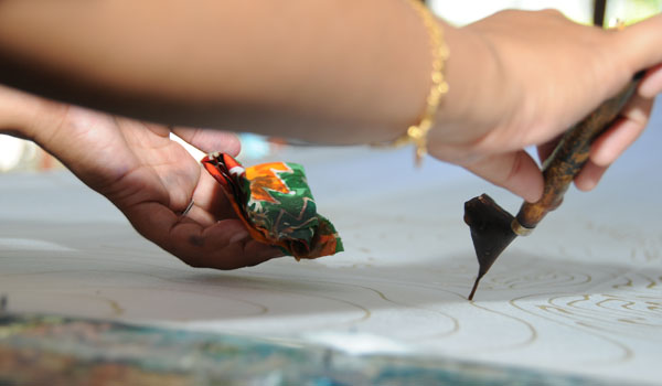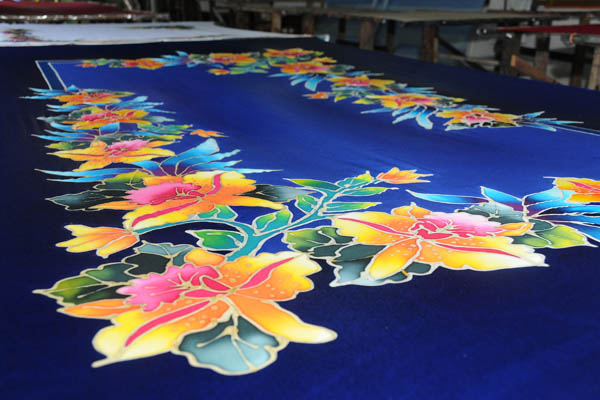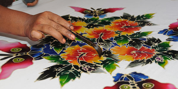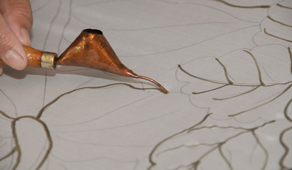 In the handdrawn batik process, molten wax is applied onto the fabric by using