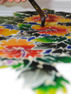 Colors dye are applied individually by brush on the required design. This includes the background colour as well.